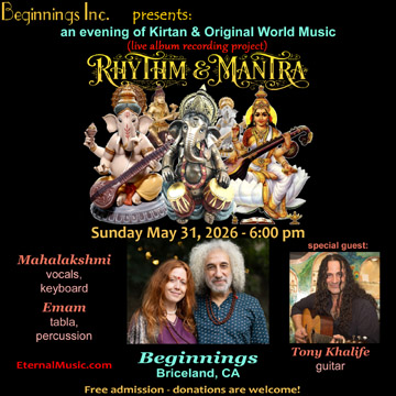 | Kirtan & Music at Beginnings Inc. - Ashland Wed. June 11th, 2025 - 7:00 PM Rhythm & Mantra Mahalakshmi (vocals, keyboard) Emam (tabla, dumbak) Beginnings Inc. 5 Cemetery Rd, Redway, CA 95560 BeginningsBriceland.org (707) 923-3617