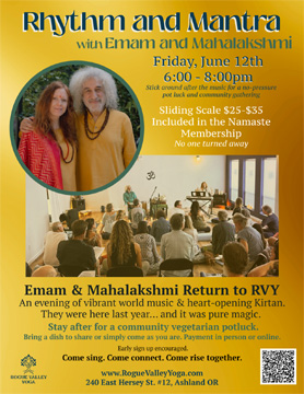 | Kirtan & Music Friday June 12/2026 - 7:00 PM Rhythm & Mantra Mahalakshmi (vocals, keyboard) Emam (tabla, percussion) Rogue Valley Yoga 240 E. Hersey Street, Ste. 12, Ashland, OR (541)256-2654 roguevalleyyoga.com