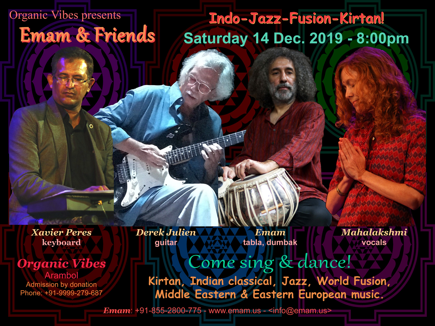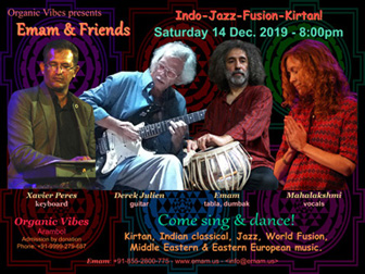 Emam & Friends at Organic Vibes World Fusion Music & Sacred World Music Xavier Peres (keyboard), Derek Julien (guitar), Mahalakshmi (vocals), Emam (tabla, dumbak) Organic Vibes Arambol, Goa | |