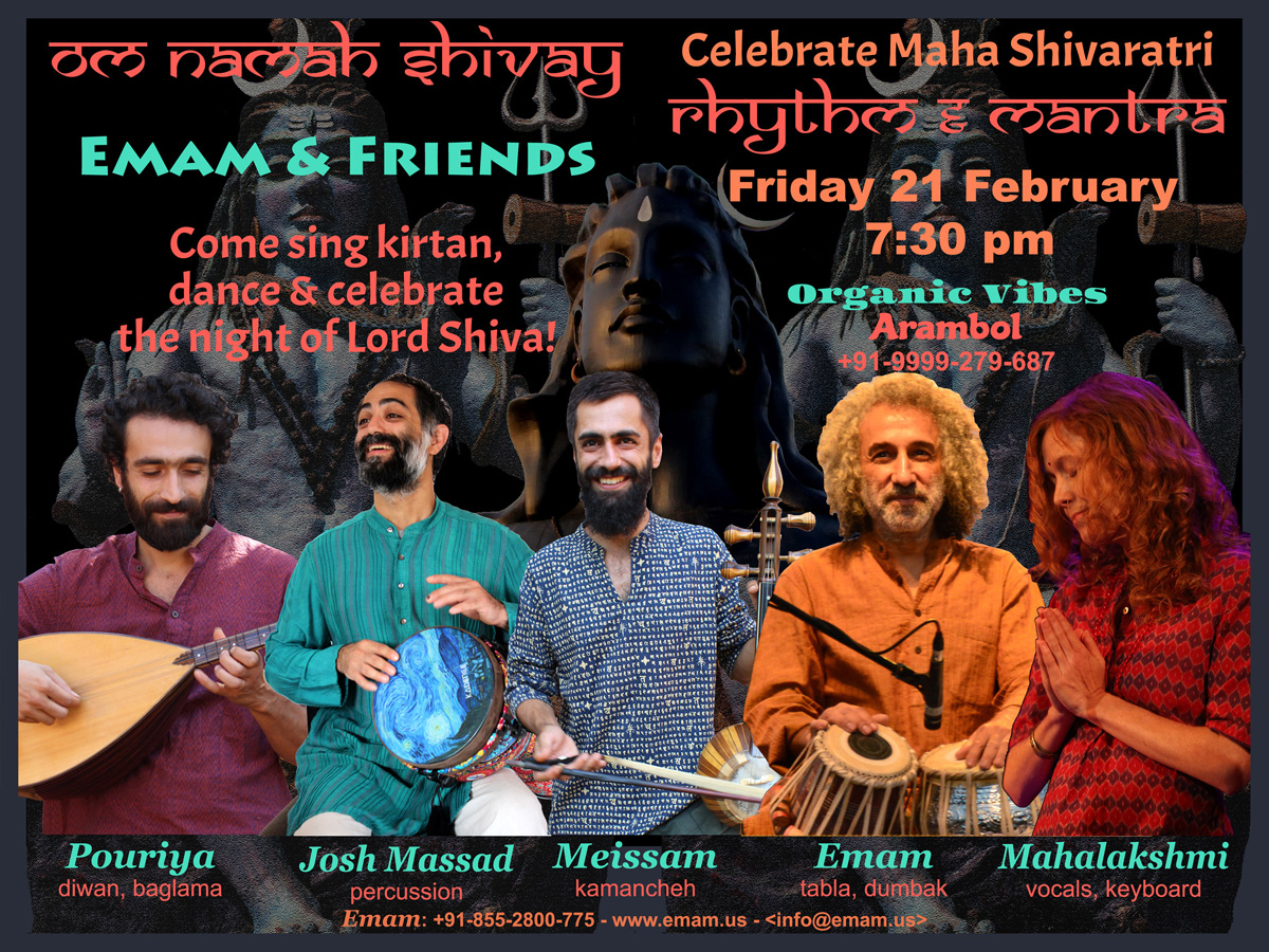 Celebrate Mahashivaratri with Kirtan Mahalakshmi (vocals, keyboard), Emam (tabla, dumbak, vocals) and other musical guests Organic Vibes Arambol, Goa | |
