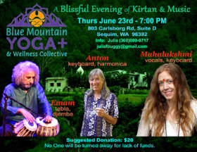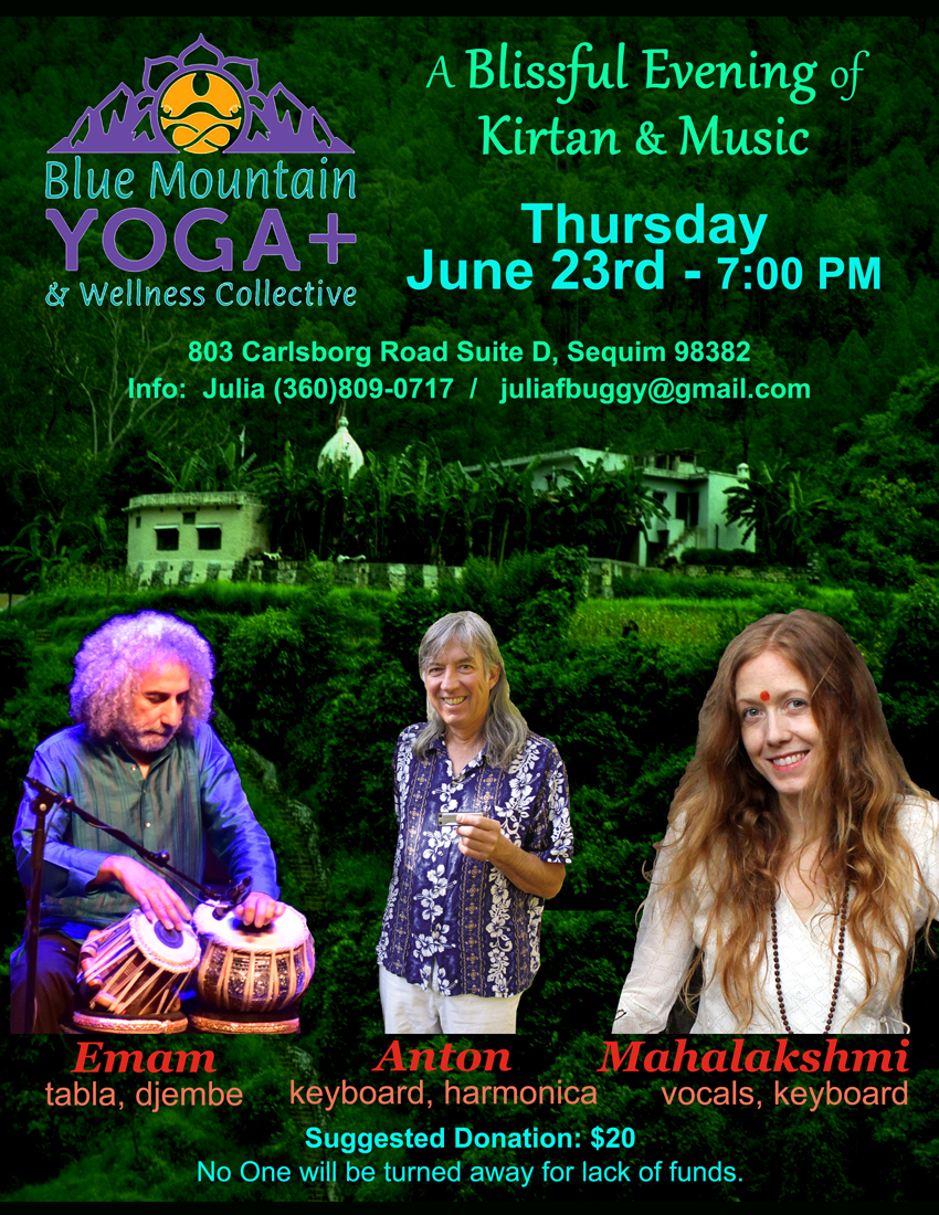 A Blissful evening of Kirtan & Music Rhythm & Mantra Mahalakshmi (vocals, keyboard) Anton (keyboard & harmonica) Emam (tabla, dumbak) Blue Mountain Yoga 803 Carlsborg Rd Ste D, Sequim, WA 98382 juliafbuggy@gmail.com / +1-360-809-0717 | |