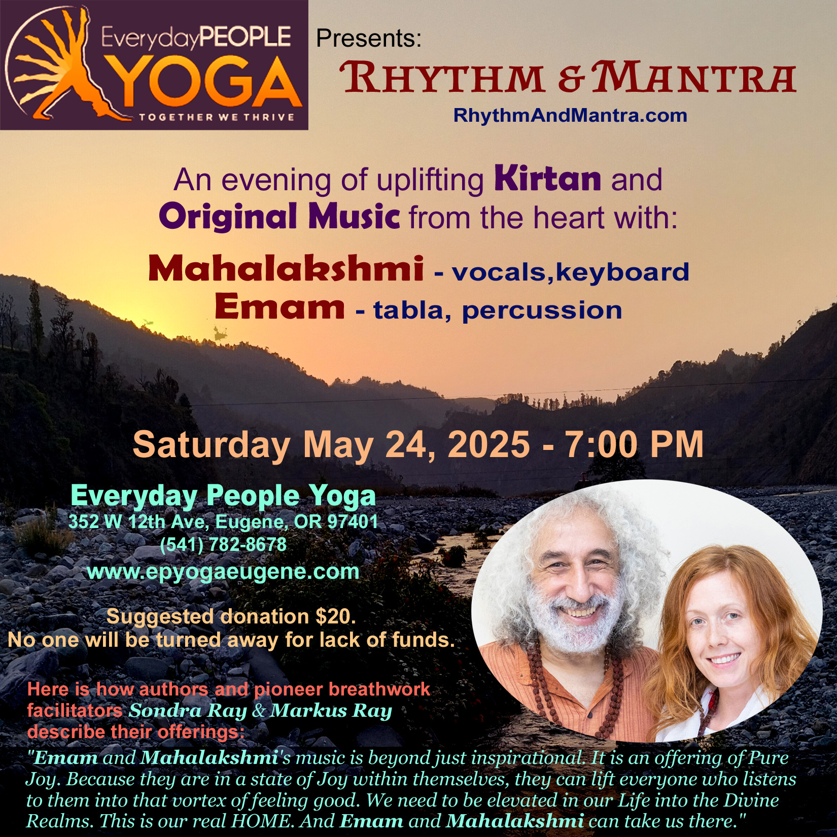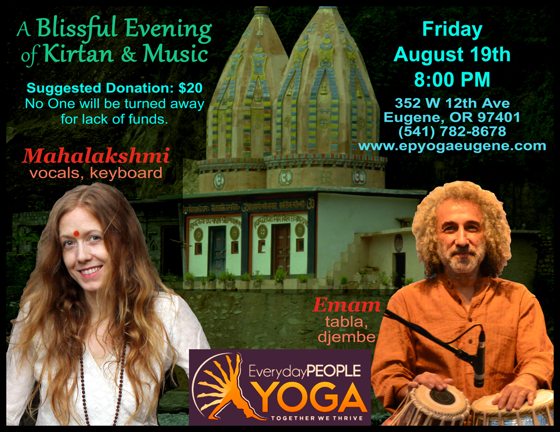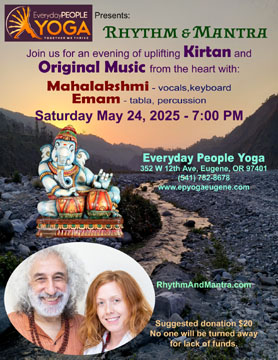 8:00 PM A Blissful evening of Kirtan & Music Rhythm & Mantra Mahalakshmi (vocals, keyboard) Emam (tabla, dumbak) Everyday People Yoga 352 W 12th Ave., Eugene, OR 97401 / 541-7828678 www.epyogaeugene.com | |