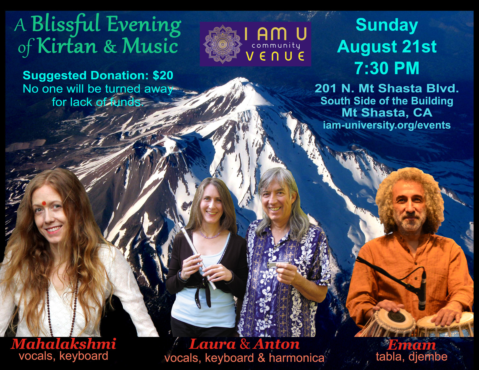 7:00 PM A Blissful evening of Kirtan & Music Rhythm & Mantra Anton (keyboard & harmonica) Laura (vocals) Mahalakshmi (vocals, keyboard) Emam (tabla, dumbak) I AM U Community Venue 201 N. Mount Shasta Blvd, Mt Shasta, CA www.iam-university.org | |
