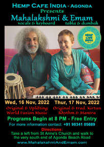 8:00 PM An Evening of traditional & original Kirtan Rhythm & Mantra Mahalakshmi (vocals, keyboard) Emam (tabla, dumbak) HEMP CAFE INDIA Agonda, South Goa | |