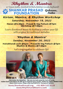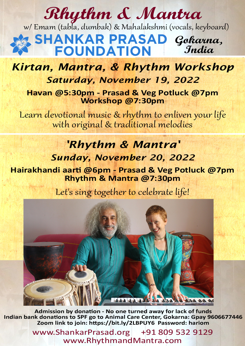 7:30 PM Kirtan, Mantra & Rhythm Workshop Rhythm & Mantra Mahalakshmi (vocals, keyboard) Emam (tabla, dumbak) SHANKAR PRASAD FOUNDATION Gokarna, Karnataka | |