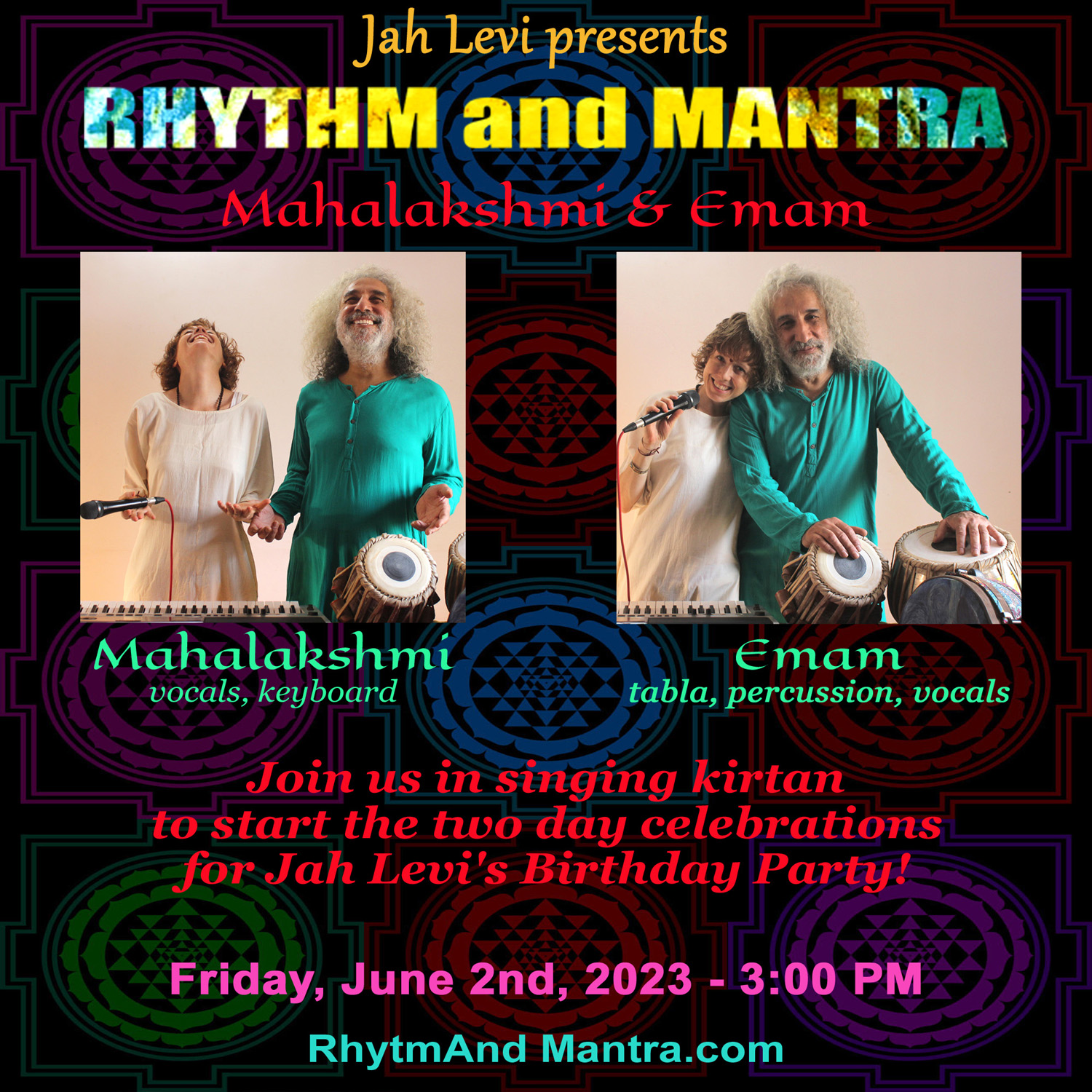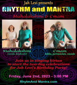 3:00 PM Opening the two day celebrations for Jah Levi's birthday party with a set of traditional & original Kirtan Rhythm & Mantra Mahalakshmi (vocals, keyboard) Emam (tabla, percussion) jah Levi's Birthday Party Private event - by invitation only! | |