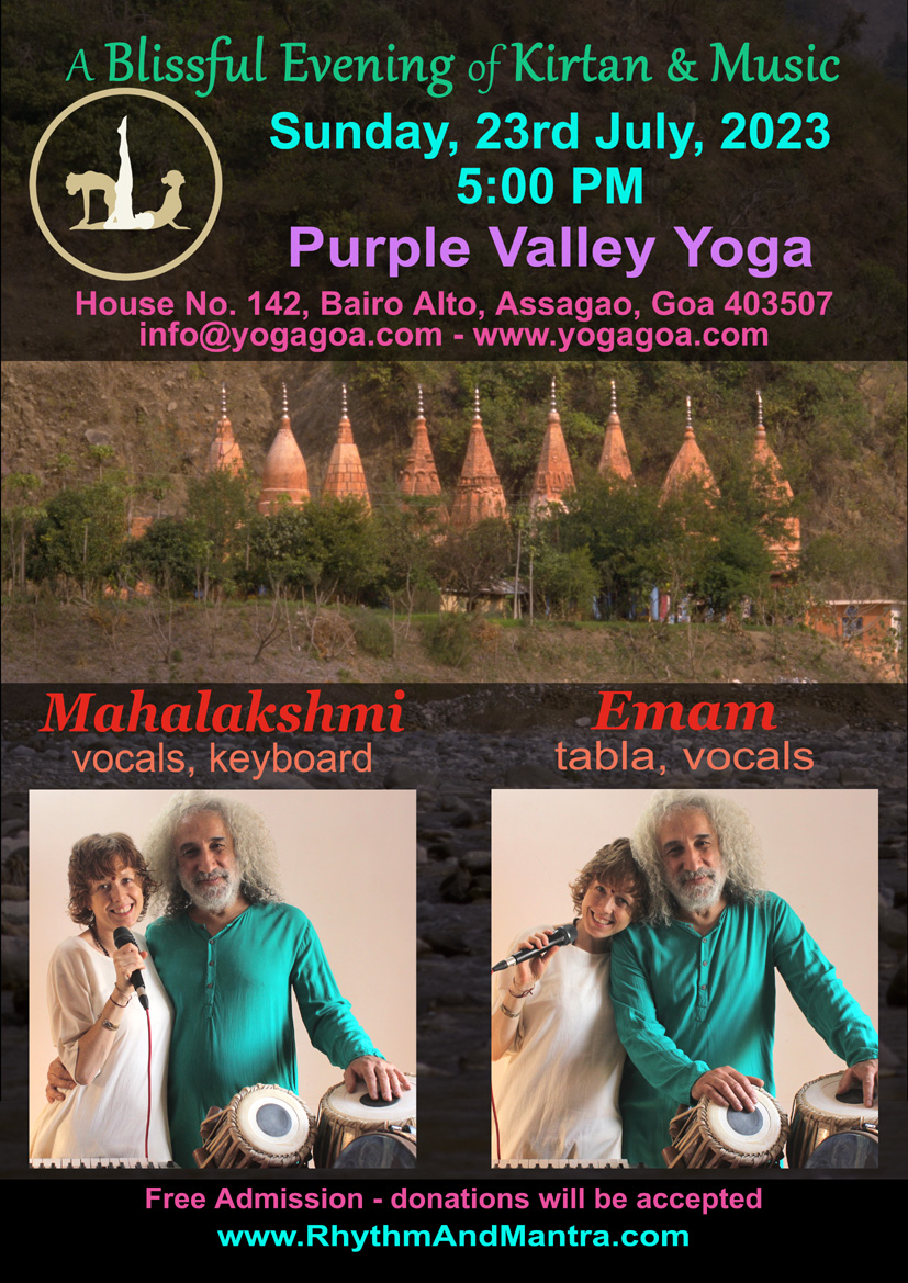 5:00 PM A Blissful Evening of Kirtan & Music Rhythm & Mantra Mahalakshmi (vocals, keyboard) Emam (tabla, vocals) Purple Valley Yoga Assagao, Goa | |