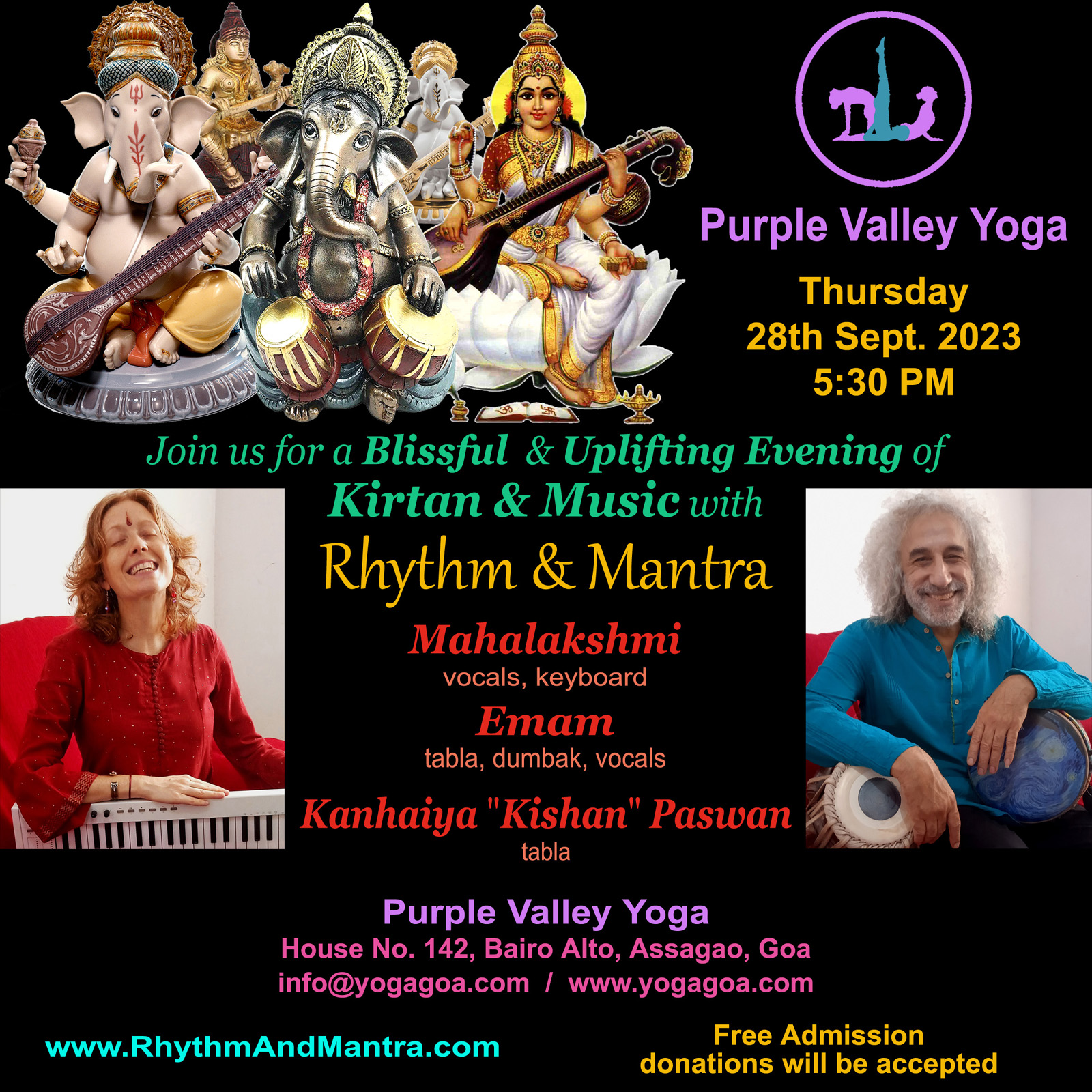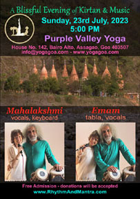 5:30 PM A Blissful & Uplifting Evening of Kirtan & Music Rhythm & Mantra Mahalakshmi (vocals, keyboard) Emam (tabla, dumbak, vocals) Kanhaiya "Kishan" Paswan (tabla) Purple Valley Yoga Assagao, Goa | |