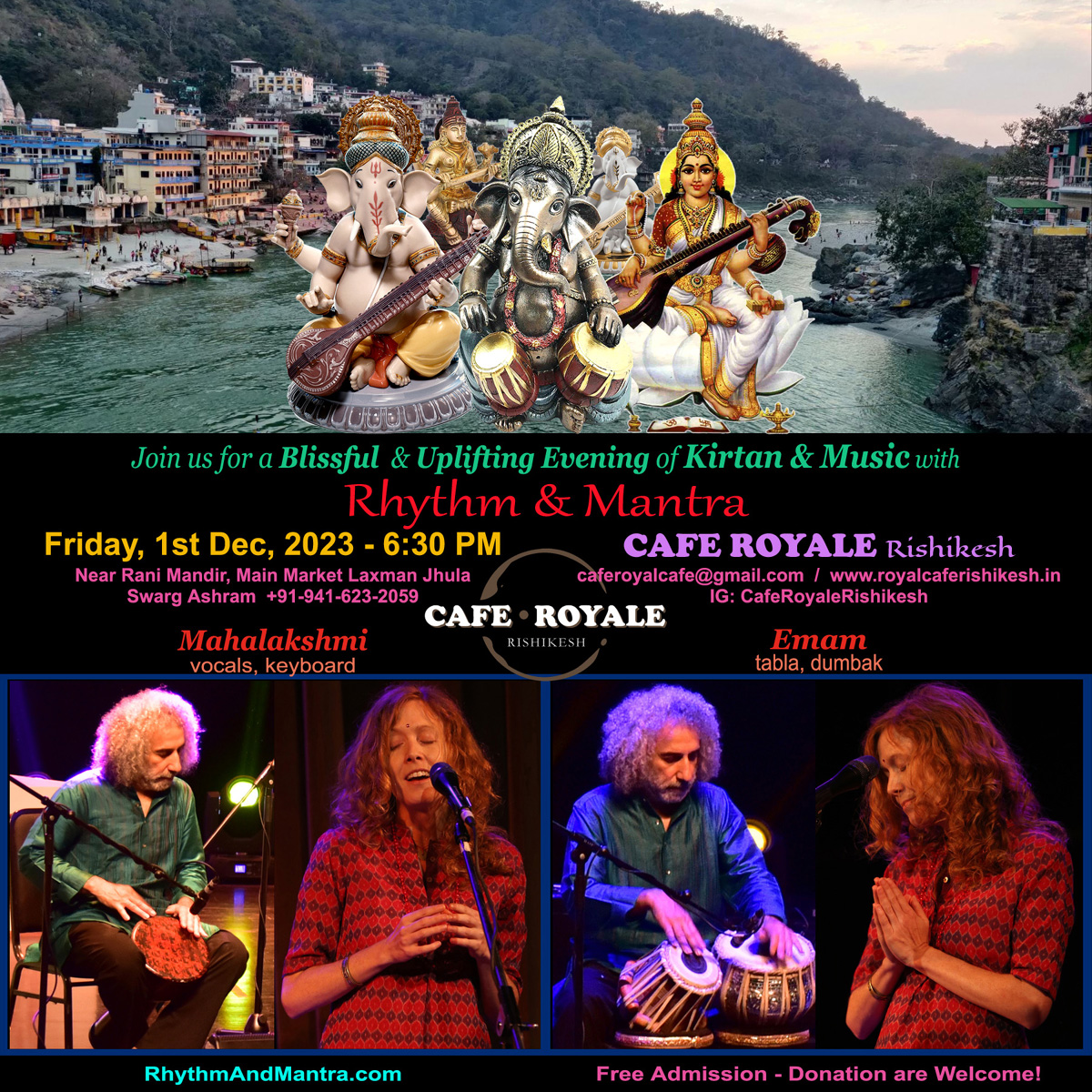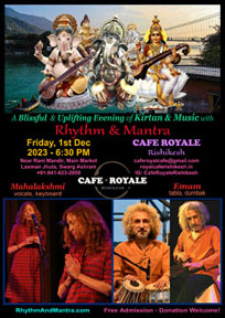6:30 PM A Blissful & Uplifting Evening of Kirtan & Music Rhythm & Mantra Mahalakshmi (vocals, keyboard) Emam (tabla, djembe, vocals) Cafe Royale Rishikesh Near Rani Mandir, Main Market Laxman Jhula | |