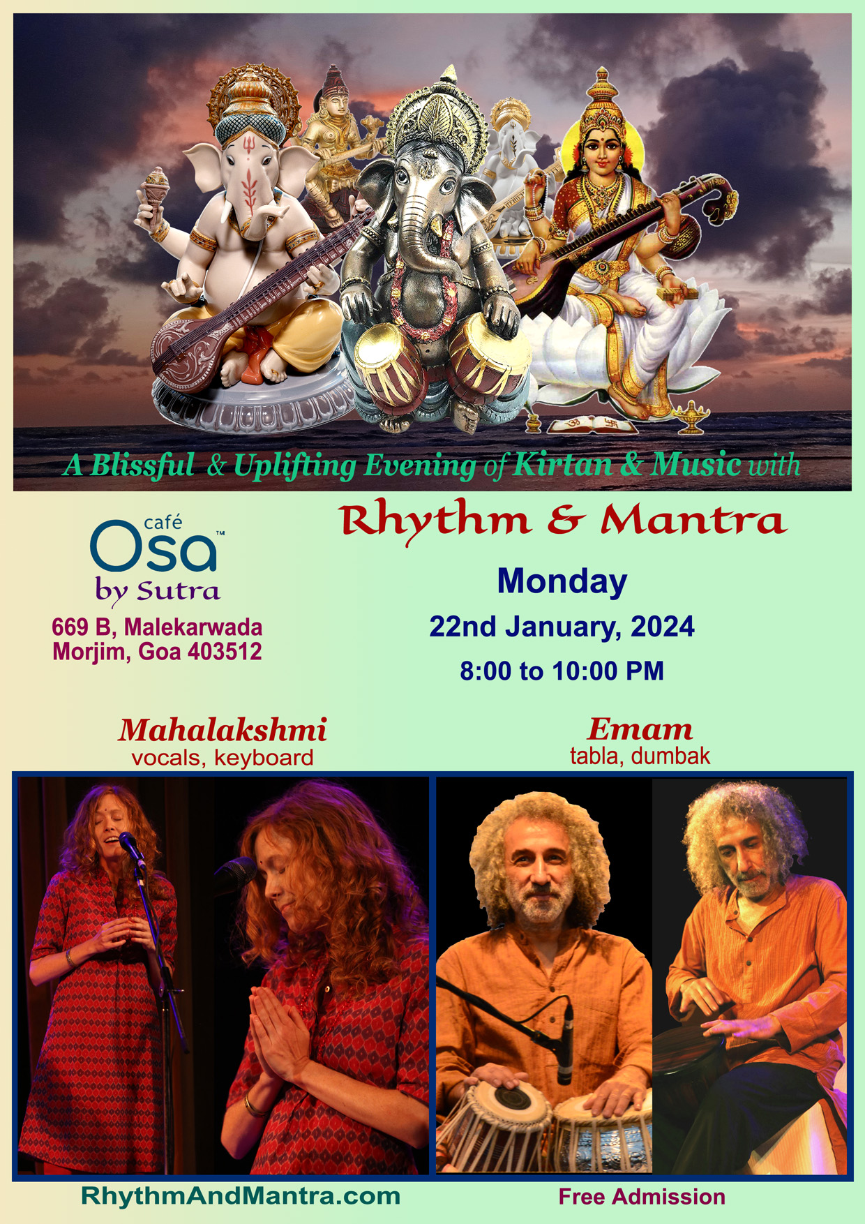 8:00 to 10:00 PM A Blissful & Uplifting Evening of Kirtan & Music Rhythm & Mantra Mahalakshmi (vocals, keyboard) Emam (tabla, djembe, vocals) Cafe Osa - by Sutra 669 B, Malekarwada, Morjim, Goa 403512 | |