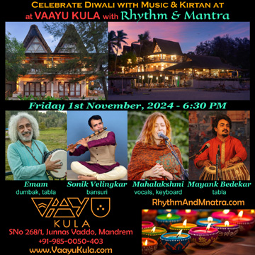 with Music & Kirtan at Vaayu Kula - Mandrem Friday 1st November/2024 - 6:30 PM Rhythm & Mantra Mahalakshmi (vocals, keyboard) Sonik Velingkar (bansuri) Mayank Bedekar (tabla) Emam (tabla, dumbak) Vaayu Kula SNo 268/1, Junnas Vaddo, Mandrem www.VaayuKula.com +91-985-005-0403 | |
