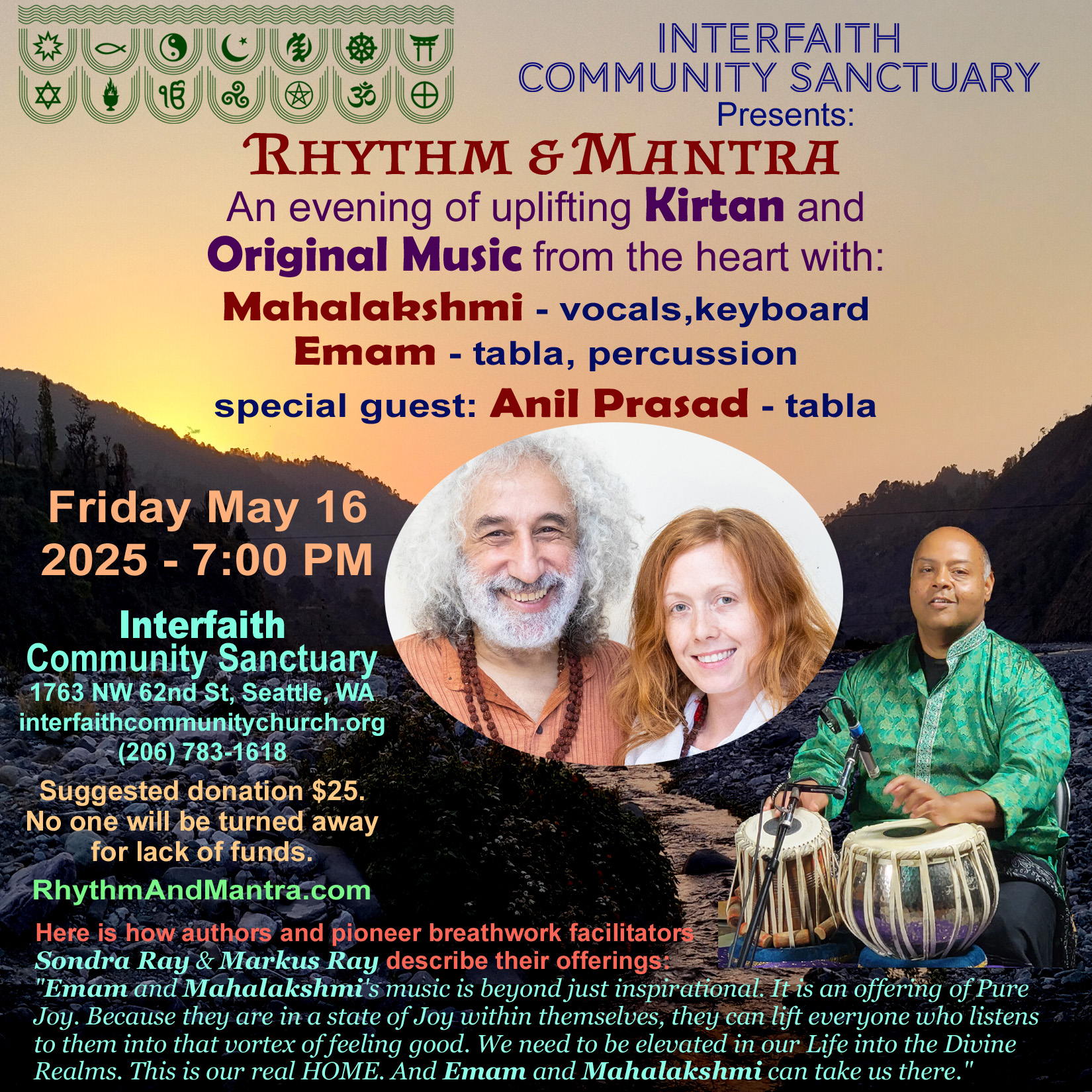 Kirtan & Music at Interfaith Community Sanctuary 1763 NW 62nd St, Seattle, WA interfaithcommunitychurch.org Thursday May 16, 2025 - 7:00 PM Rhythm & Mantra Mahalakshmi (vocals, keyboard) Emam (tabla, dumbak) | |