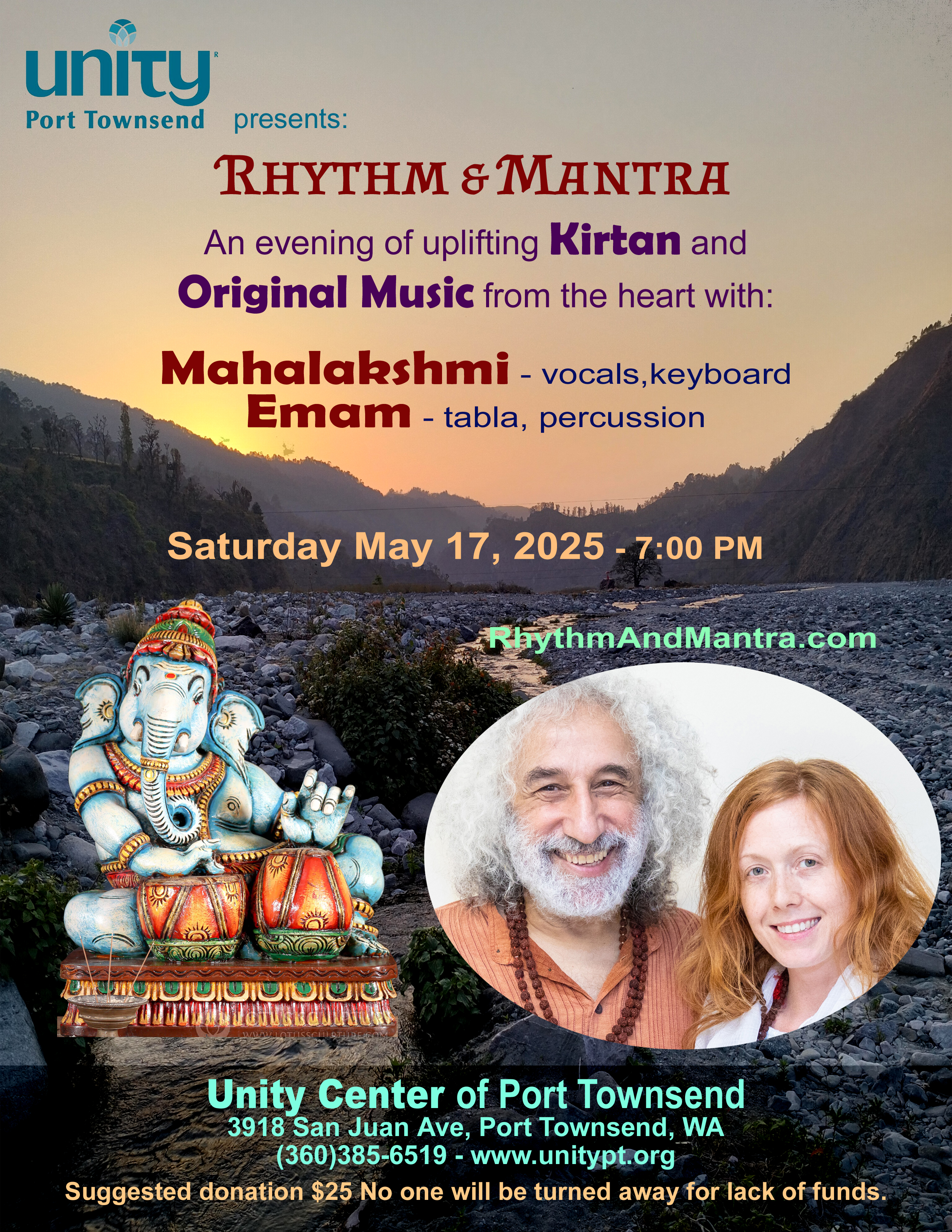 Kirtan & Music at Unity Center of Port Townsend 3918 San Juan Ave, Port Townsend, WA www.unitypt.org Saturday May 17, 2025 - 7:00 PM Rhythm & Mantra Mahalakshmi (vocals, keyboard) Emam (tabla, dumbak) | |