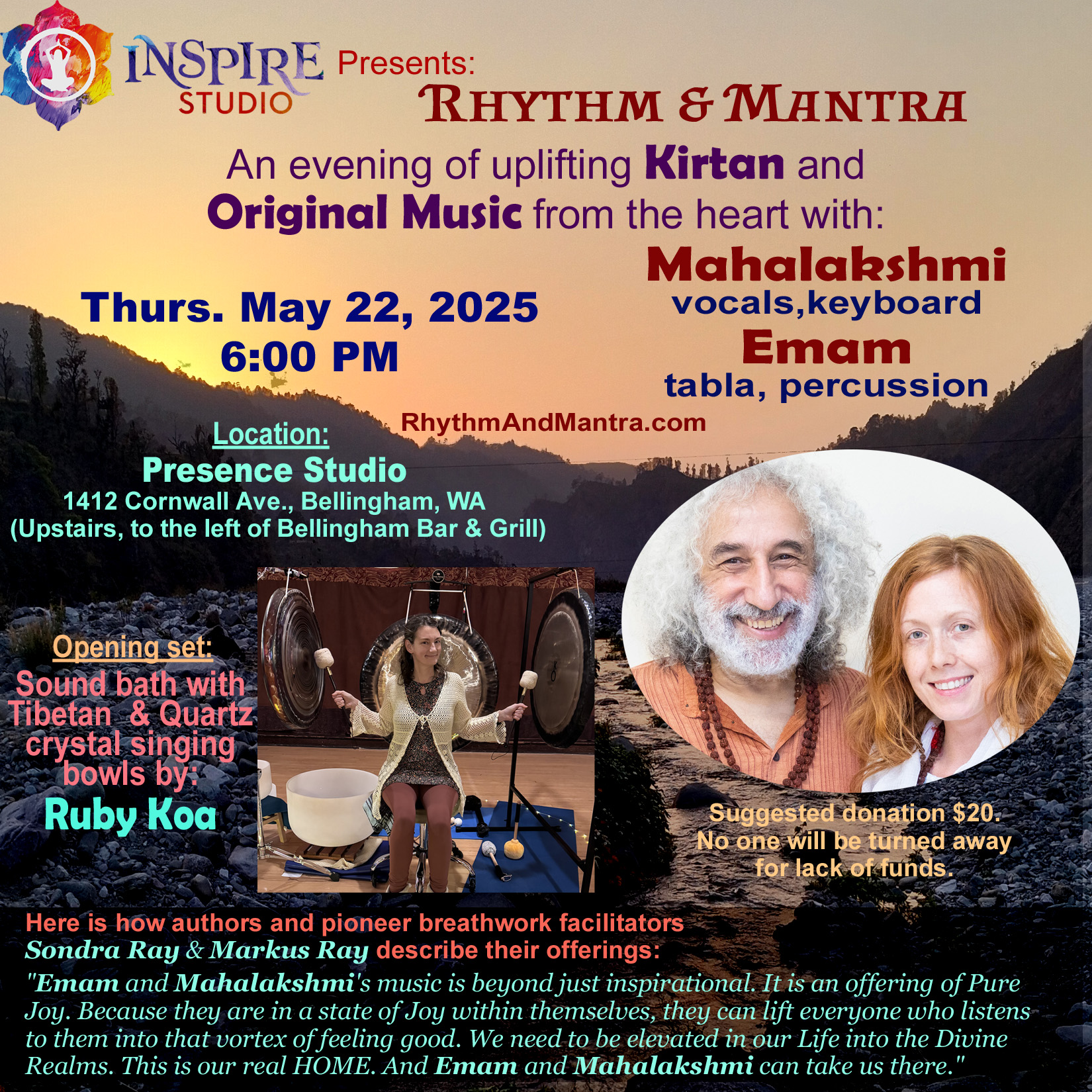 Kirtan & Music at Presence Studio 1412 Cornwall Ave., Bellingham, WA Thursday May 22, 2025 - 6:00 PM Rhythm & Mantra Mahalakshmi (vocals, keyboard) Emam (tabla, dumbak) Opening set: Sound bath with Tibetan & Quartz crystal singing bowls with Ruby Koa Presented by: Inspire Studio | |