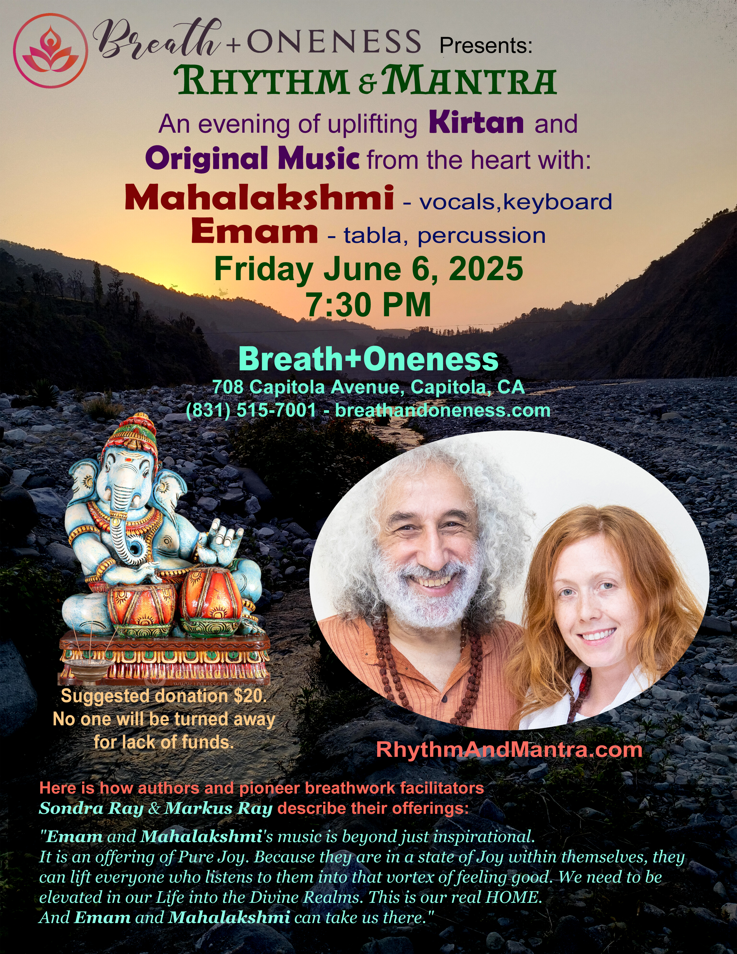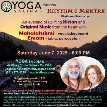 Kirtan & Music at Breath + Oneness Yoga - Capitola Friday June 6th, 2025 - 7:30 PM Rhythm & Mantra Mahalakshmi (vocals, keyboard) Emam (tabla, dumbak) Breath + Oneness Yoga 708 Capitola Avenue, Capitola, CA 95010 www.breathandoneness.com (831) 515-7001 |