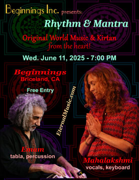 Kirtan & Music at Beginnings Inc. - Ashland Wed. June 11th, 2025 - 7:00 PM Rhythm & Mantra Mahalakshmi (vocals, keyboard) Emam (tabla, dumbak) Beginnings Inc. 5 Cemetery Rd, Redway, CA 95560 BeginningsBriceland.org (707) 923-3617 |