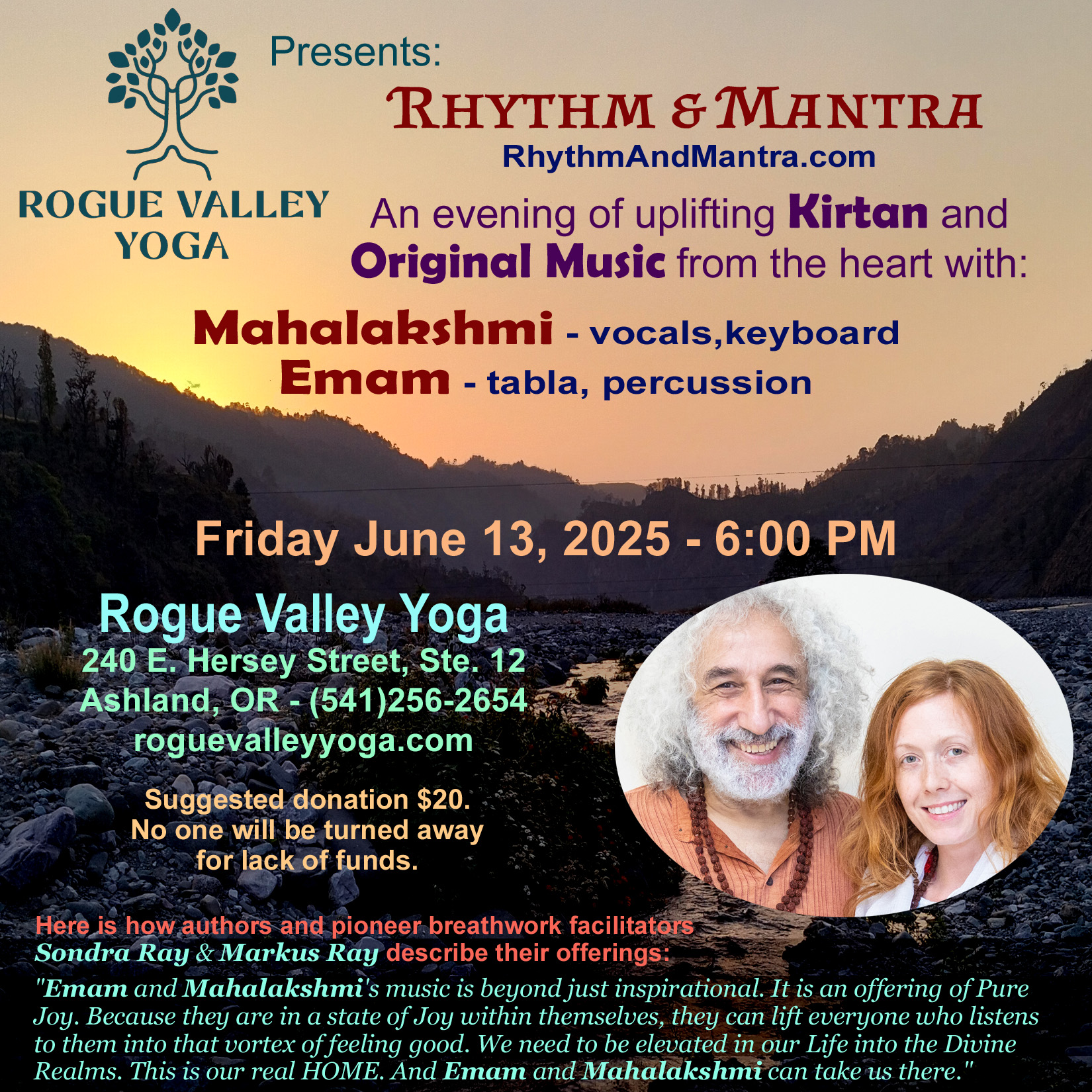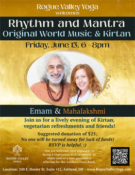 Kirtan & Music at Rogue Valley Yoga - Ashland Friday June 13th, 2025 - 6:00 PM Rhythm & Mantra Mahalakshmi (vocals, keyboard) Emam (tabla, dumbak) Rogue Valley Yoga 240 E. Hersey Street, Ste. 12, Ashland, OR roguevalleyyoga.com (541)256-2654 |