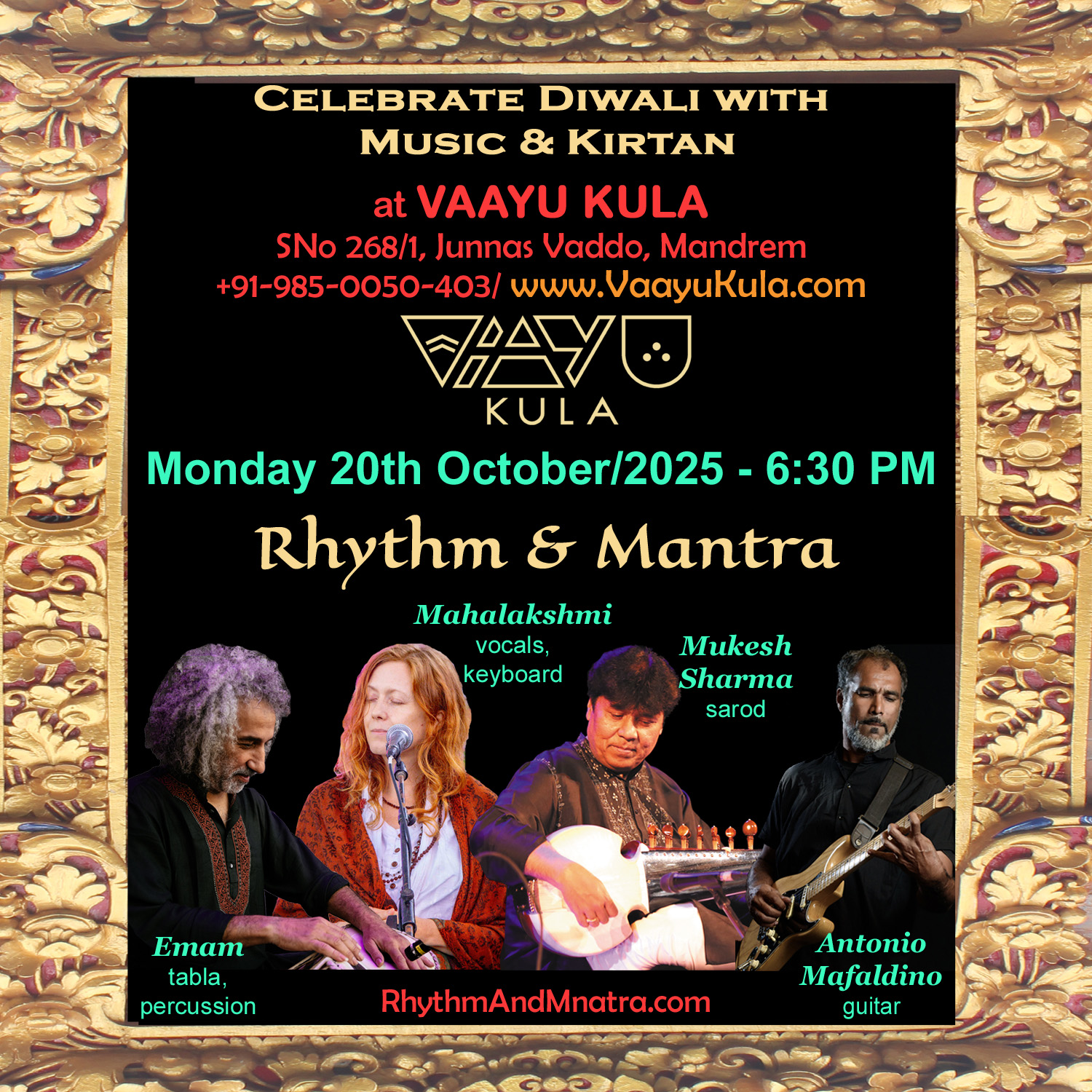 with Music & Kirtan at Vaayu Kula - Mandrem Monday 20th October/2025 - 6:30 PM Rhythm & Mantra Mahalakshmi (vocals, keyboard) Mukesh Sharma (sarod) Antonio Mafaldino (guitar) Emam (tabla, percussion) Vaayu Kula SNo 268/1, Junnas Vaddo, Mandrem www.VaayuKula.com +91-985-005-0403 |